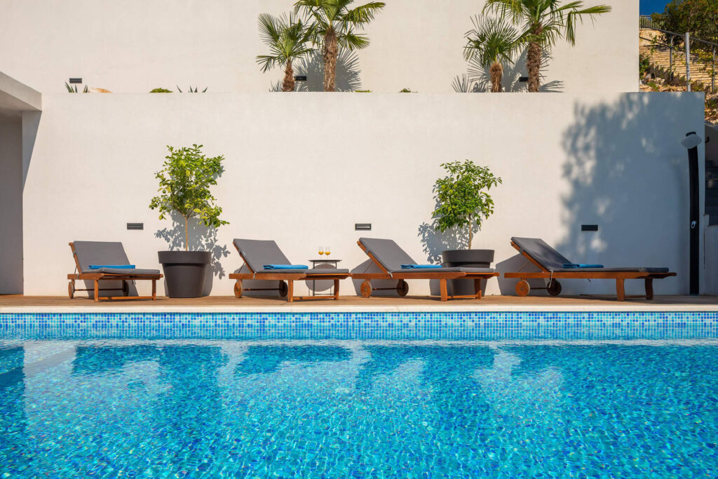 In addition to the main living spaces, the villa offers four spacious bedrooms each featuring a contemporary modern design and corresponding bathroom with shower. Exclusively for its guests, within the property courtyard is a heated infinity pool with hydromassage.