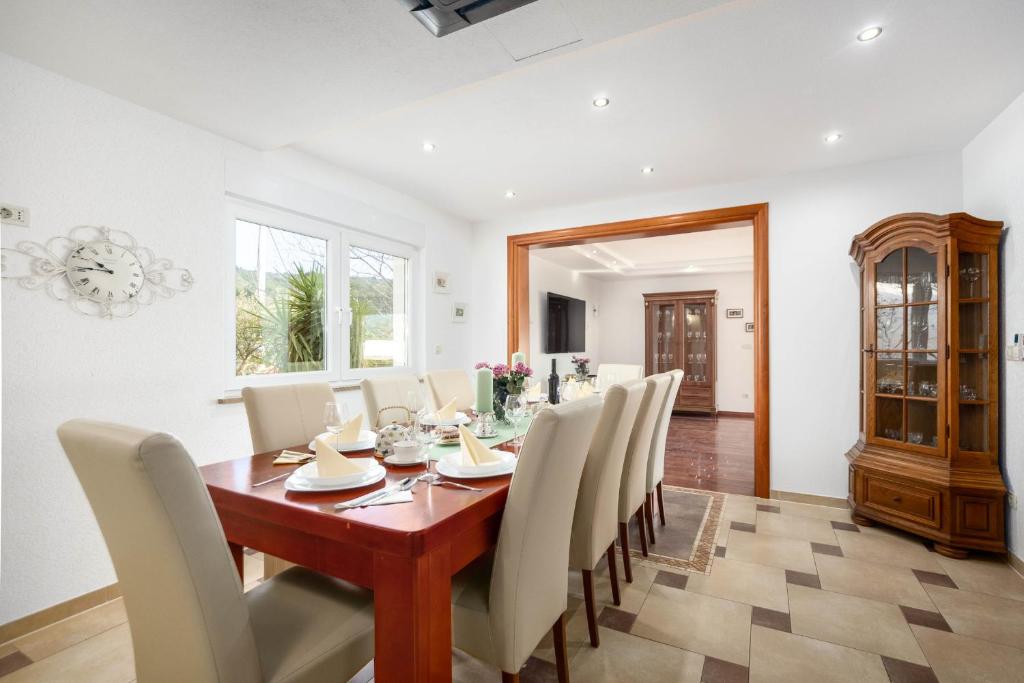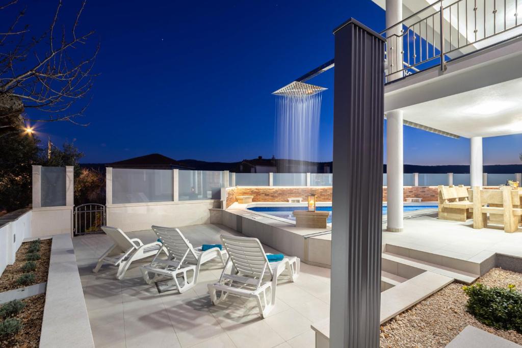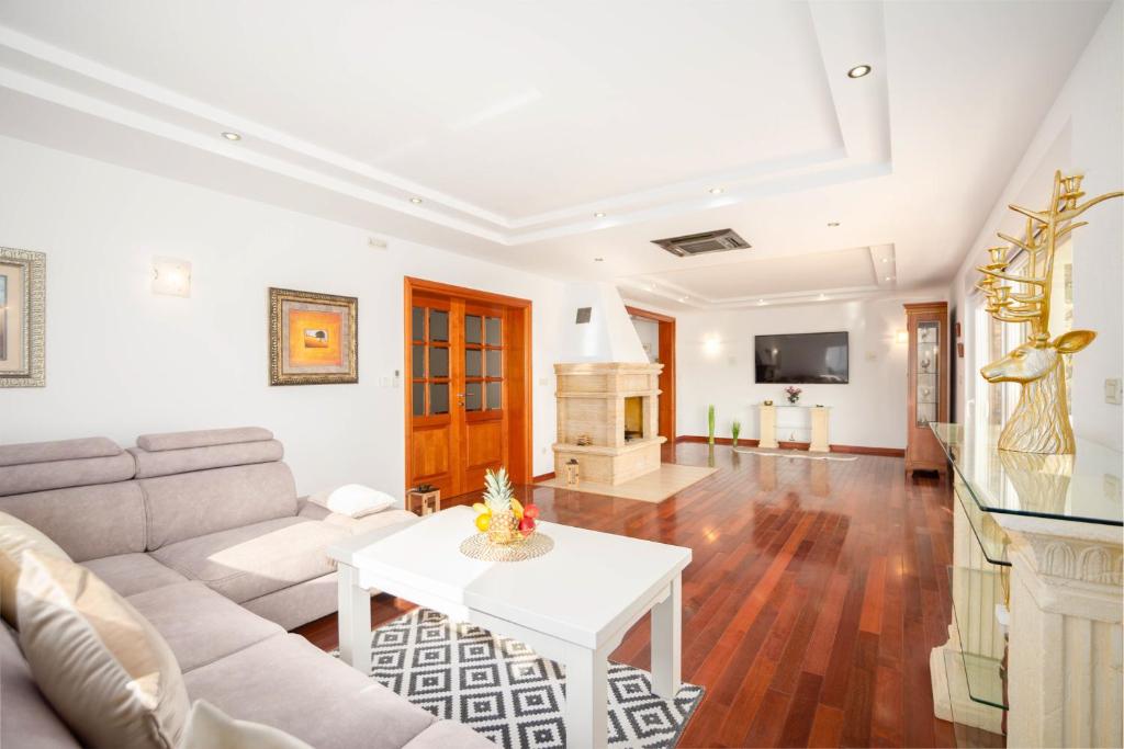 Villa Ivana a is ideal for accommodating up to 8 persons, the size of the house is 260 m² and it spreads over two floors. The ground floor has a large living room that opens to the swimming pool area and a sun terrace. Also, there is a well-equipped kitchen with a dining table and a bathroom with a shower and toilet. There are four double bedrooms (one with a large terrace overlooking the sea) on the first floor, another bathroom with a shower and toilet and additional toilette. Both floors are air-conditioned and have internet coverage. This 4 Bedrooms Villa provides accommodation with on-site parking, laundry, internet, BBQ, sundeck terrace. The nearest beach is only a few minutes‘ walk from the villa. We are renting the entire house – everything is included! Big enough for the whole family/group of friends.