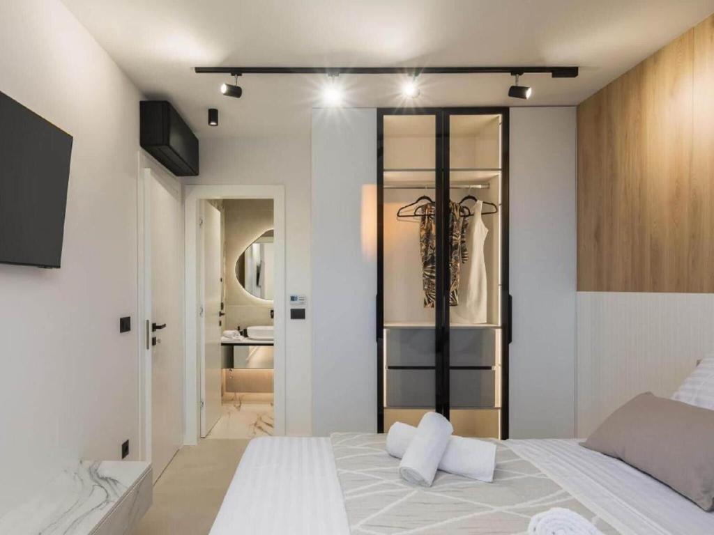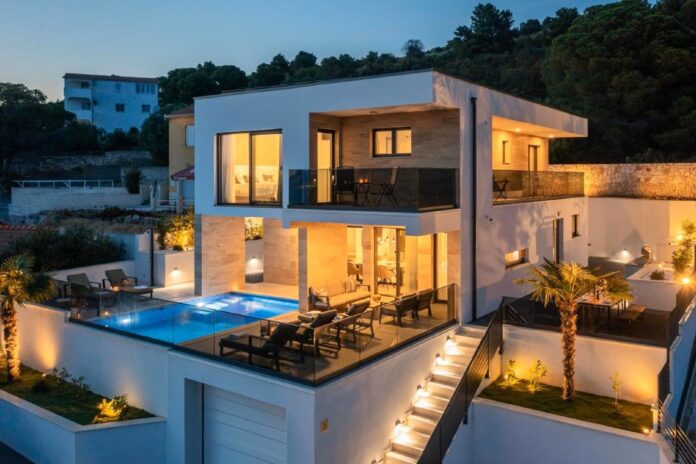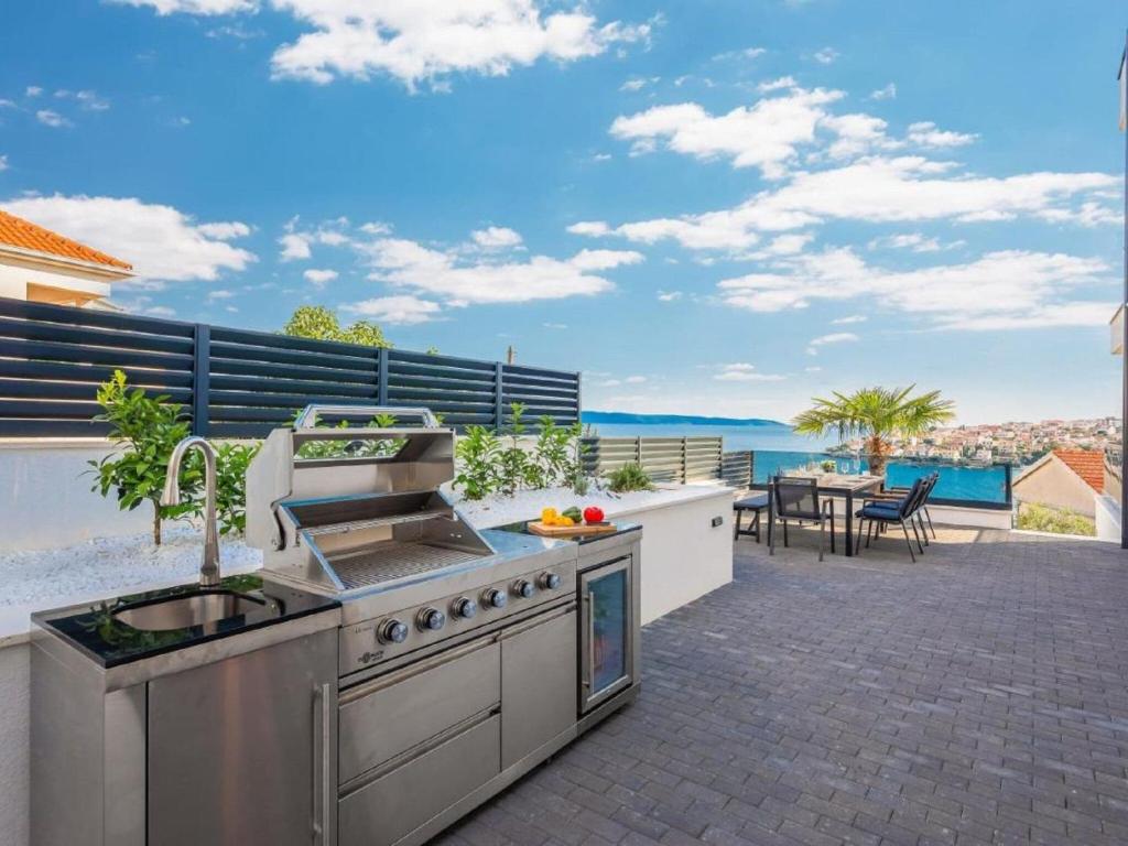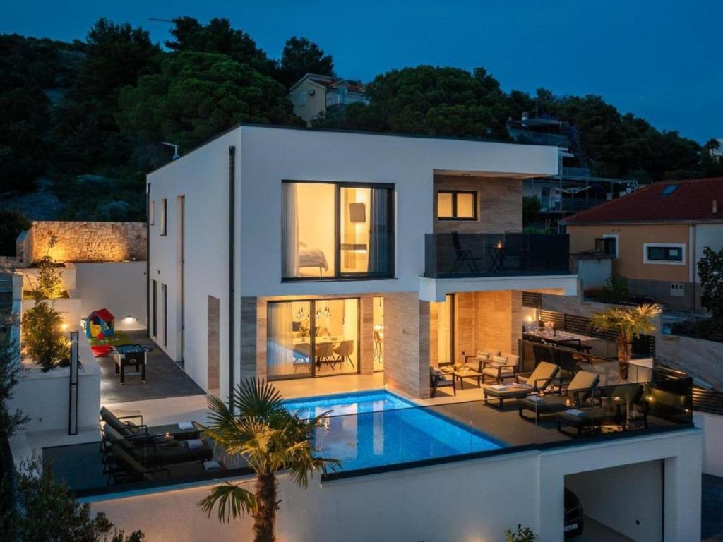 Nestled just 350 m from the sea and 3 km from Trogir?s historic center, this elegant 4-bedroom villa offers a luxurious stay for up to 8 guests. With a private pool, fenced garden, and multiple terraces, it?s a perfect blend of comfort and coastal charm, ideal for families or groups. Each bedroom features a double bed, en-suite bathroom, smart TV, and air conditioning, with upper rooms opening to private balconies.