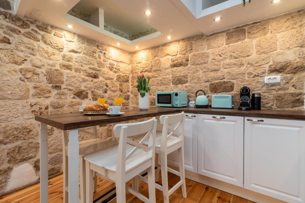 Comfortable Accommodation: Manero in Trogir offers a holiday home with two bedrooms and three bathrooms. The property features air-conditioning, a washing machine, and a fully equipped kitchen with a coffee machine and stovetop.