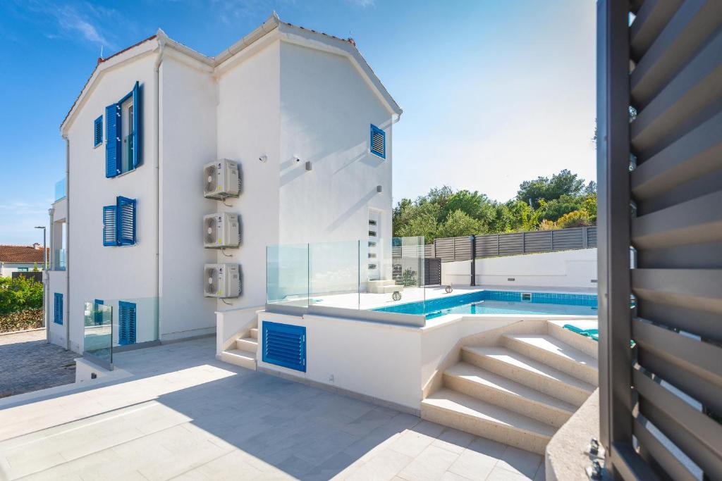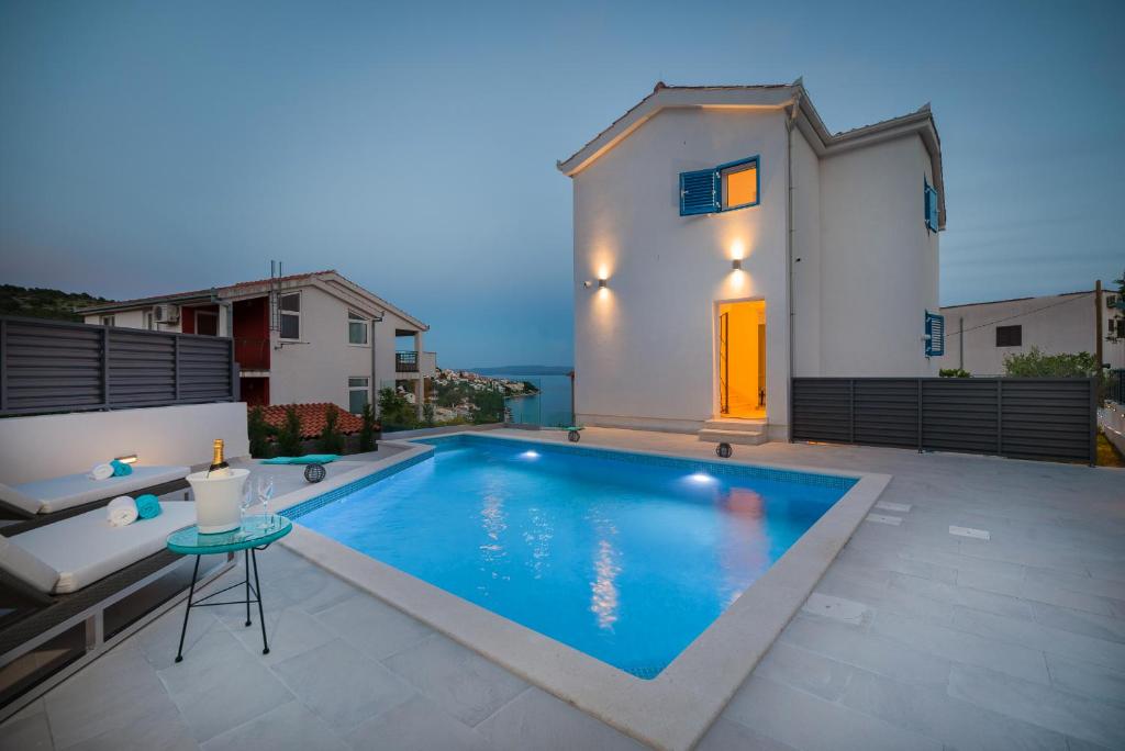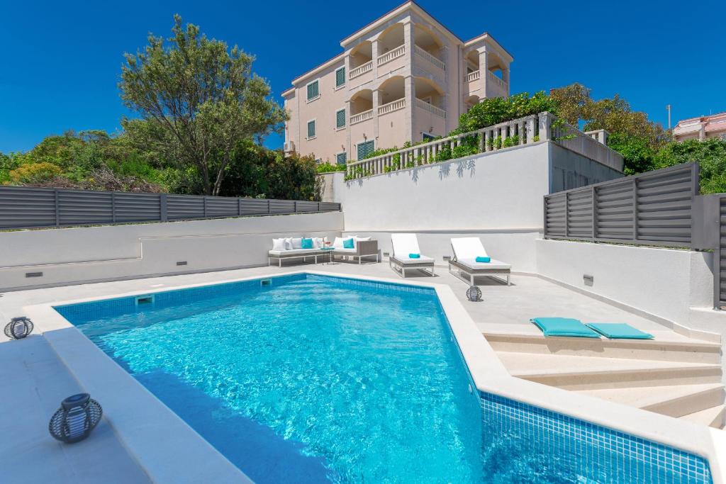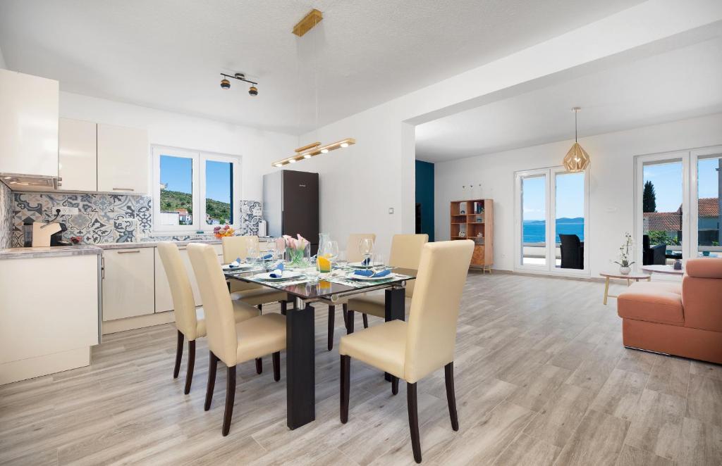 Beachfront Location: Villa Miholina in Okrug Gornji offers direct beachfront access with stunning sea views. Guests can relax by the heated swimming pool with a view or enjoy the sun terrace and lush garden.
