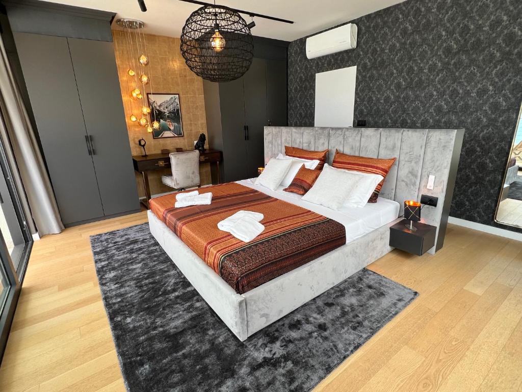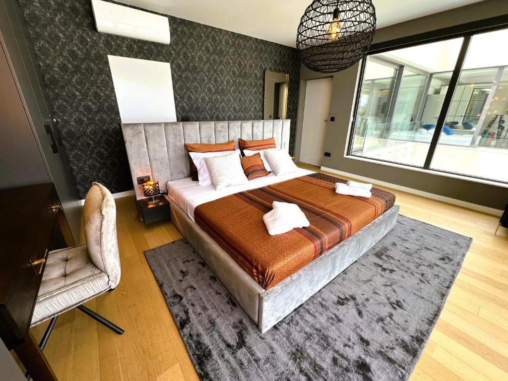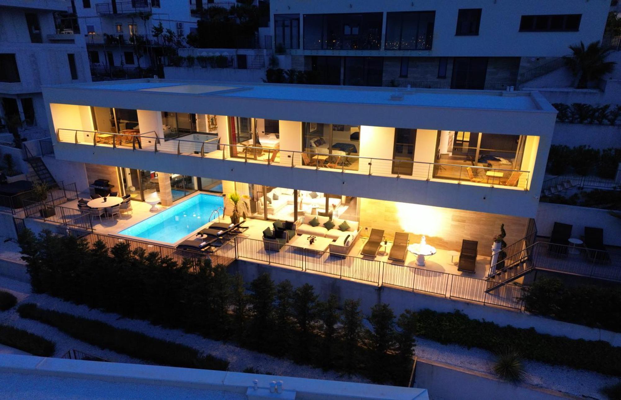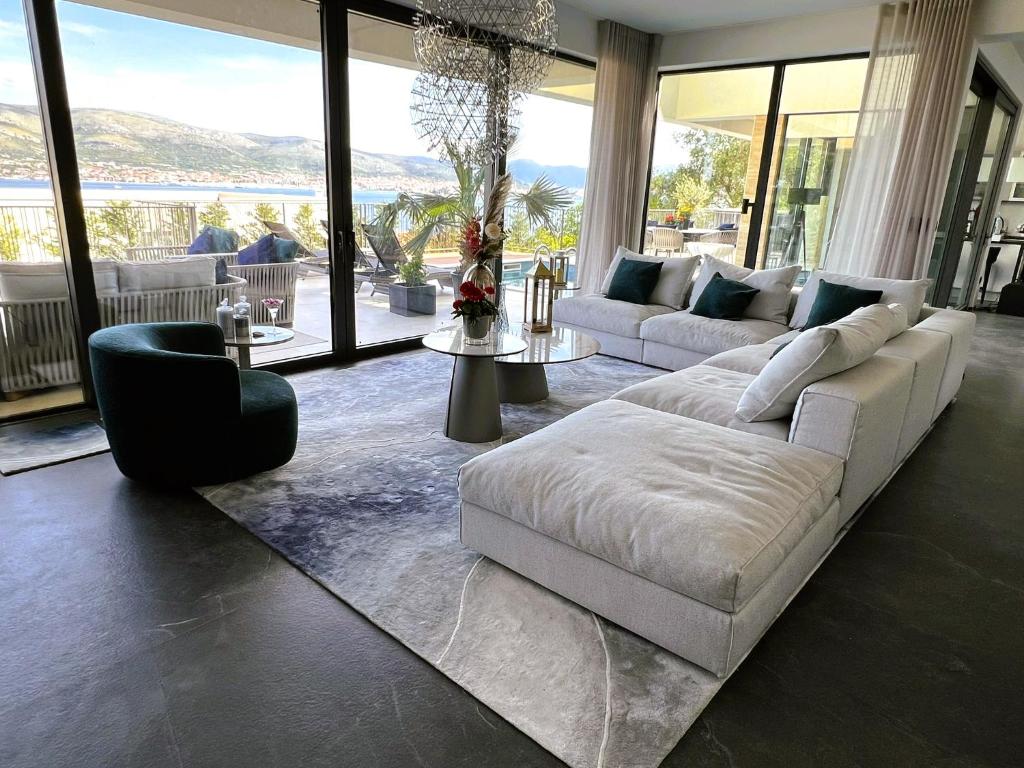 The villa combines fantastic contemporary architecture with luxurious Italian interiors and a touch of antic art including various sculptures. Villa Sophie Emilie offers breathtaking views from all rooms at the sea and the entire Trogir Bay with its beautiful cities and mountains. The tiled terrace stretches along the entire length of the villa, and is richly equipped with sunbeds, lounge furniture, little fountains and an outdoor dining area with barbecue.