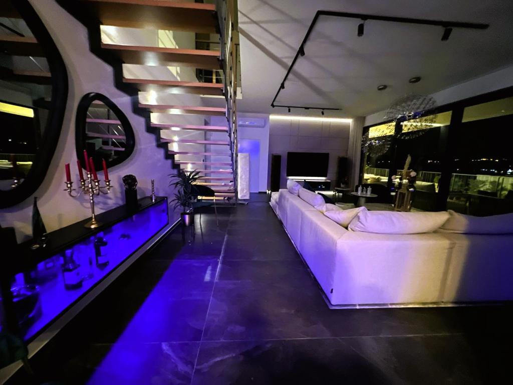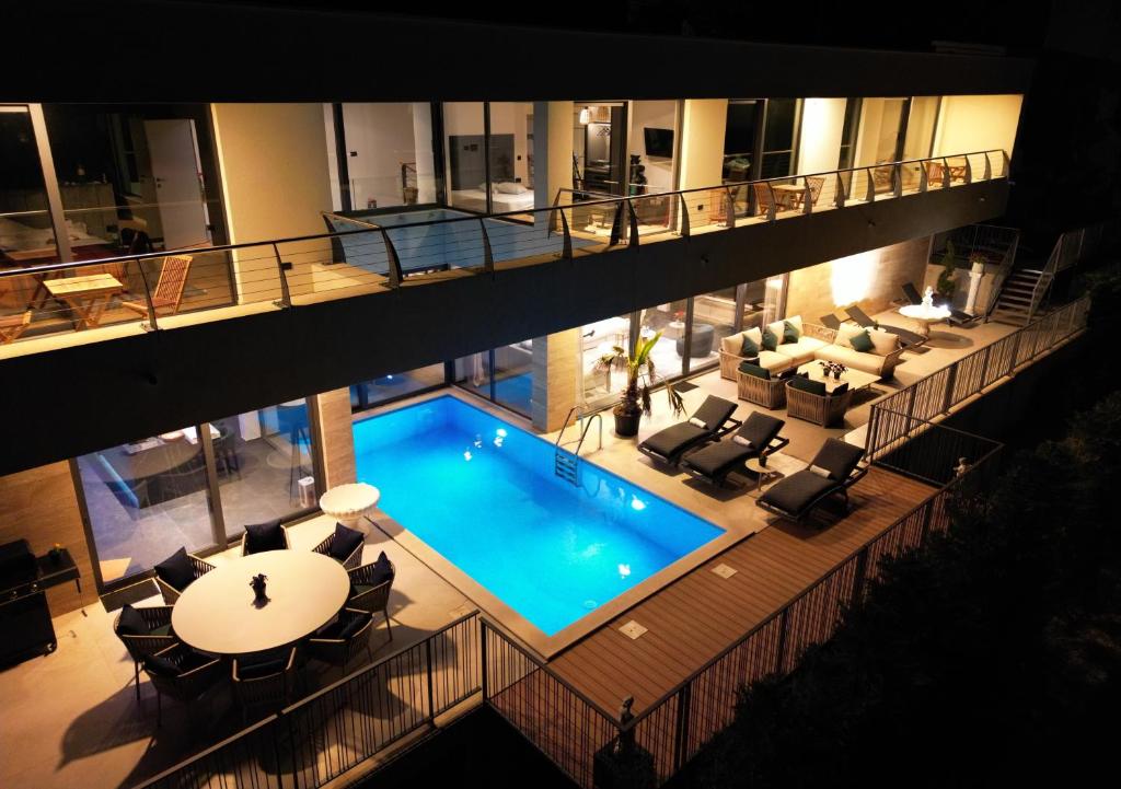 The villa features a heated pool, an outdoor whirlpool and shower, a fully equipped gourmet kitchen, full air conditioning and large flat screen TVs in all rooms, luxurious ambient lighting, spacious closets and balconies for all bedrooms as well as fully motorized curtains keeping light out for your perfect sleep. High ceilings and large sliding windows everywhere in the Villa allow the entire ground floor to be connected to the pool terrace, which creates the impression of a unique large space.