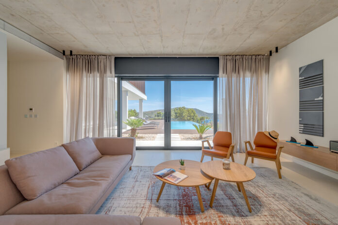 The equally modern wide wooden staircase leads you to the second floor where the 4 double bedrooms are located. The bedrooms are modern but functional and comfortably designed to ensure a good night’s sleep and rest. All rooms are equipped with air conditioning and each has a TV and en-suite bathroom. There is also a terrace on the upper floor where you can enjoy the beautiful view over a coffee or tea. Leaving the living room, right next to the large pool, you will find an external dining area with mesmerizing sea views where you can enjoy your meals with family and friends.