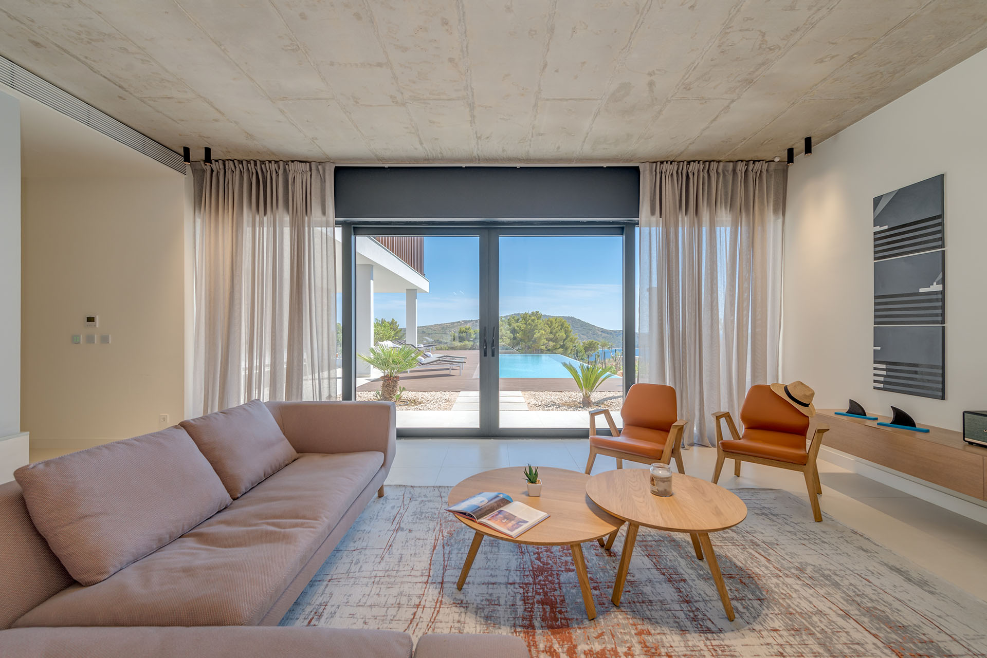 The villa has a stunning modern design, equipped with all the necessary amenities for a carefree and relaxing vacation for a maximum of 8 guests. The first floor is laid out as a large open space and houses a comfortable modern retro-style living room with fireplace and direct access to the outdoor area and pool. The living room flows into a beautiful bright dining area and a modern kitchen with all the necessary amenities.